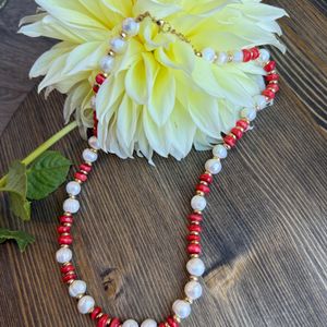 Dyed red shell slices layered with ivory potato pearls and gold plated spacers. All are durable, tarnish resistant gold PVD. Necklace measures approximately 17.5 inches in length with a 2 inch extender.